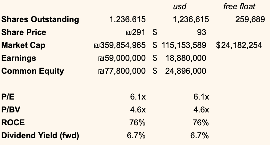 The business earned ₪59M attributable to common shareholders on ₪77.8M of equity in FY2025. Pay 4.6x book for a business earning 76% ROE, and you're getting a 16.5% earnings yield.